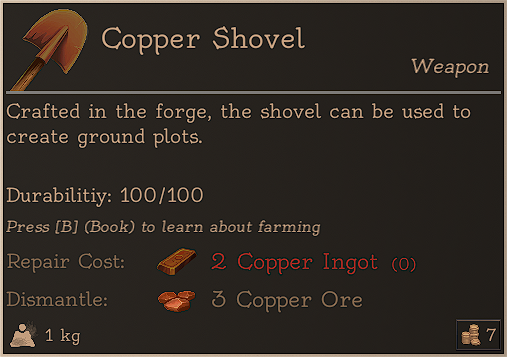 Copper Shovels can be found when looting houses or crafted at Level 16 in the Forge using Branches x30 and Copper Ingots x5. It does not need finishing in the Anvil.