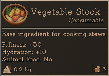 Vegetable StockBase for all StewsOnion x2 Carrot x1 Potato x1 Water Jar x1Fullness +30 Hydration +103:00