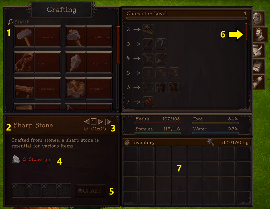 | Sharp Stone | 1 | 0:02 | Plant Fibre x25 | Crafting Item | ||