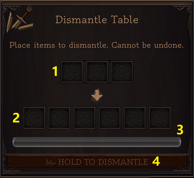 | Dismantle Table | 22 | 0:20 | Plank x12 Rope x4 Stone brick x6 Iron Rivets x8 | See below |