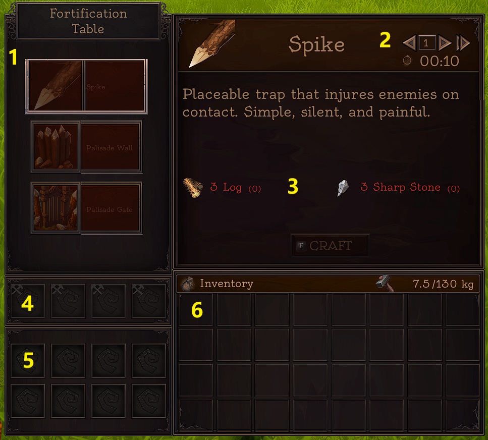 | Fortification Table | 13 | 0:12 | Plank x14 Sharp Stone x10 Bark x10 | See below |