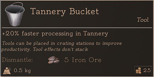 | Tannery | 10 | 2:00 | Branch x3 Rope x8 Hide x10 | see below |