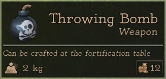 Throwing Bomb is unlocked at Level 22 and is crafted in the Fortification Table requiring Coal x10 and Fat x10.