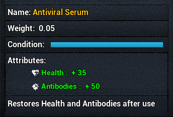 | Antiviral Serum | Health +35 Antibodies +50 |