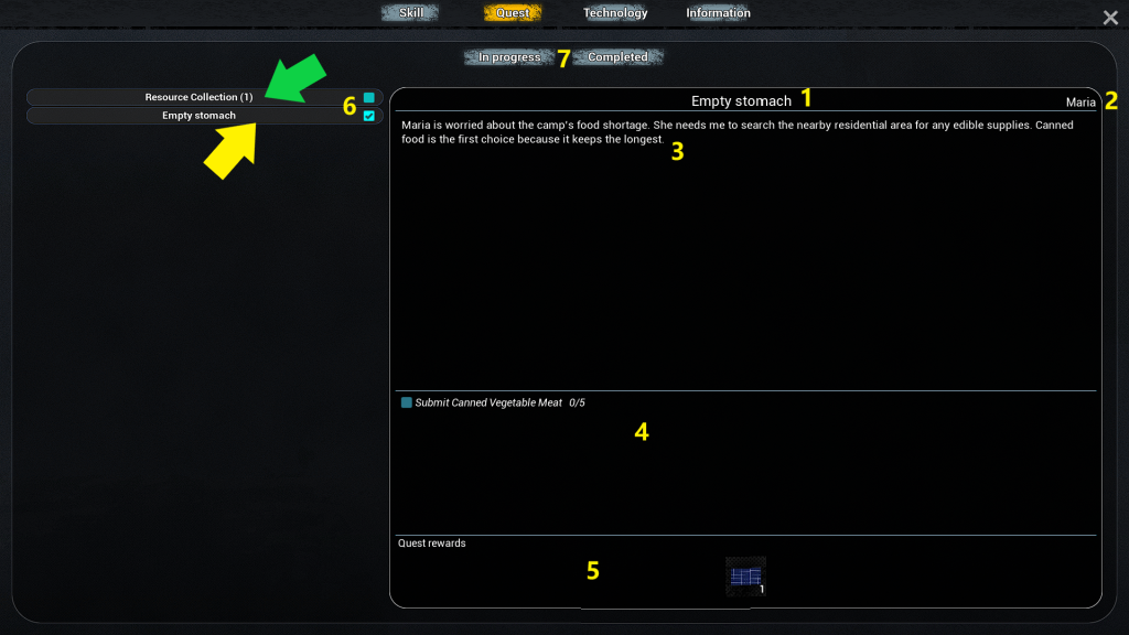 Update 1.0 brought in a new NPC Quest System, this is not to be confused with the NPC’s that you can rescue but the Quests/Missions which are obtained from the Merchants/Traders and can be tracked in the new Quest tab found in the Inventory. These have replaced the old signal missions which is now a building called the Signal Tower and more information can be found here.