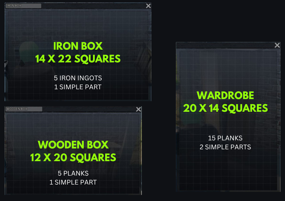 **SIZE OF CONTAINER: How many squares the container uses when placed inside a vehicle, cart, or chest.