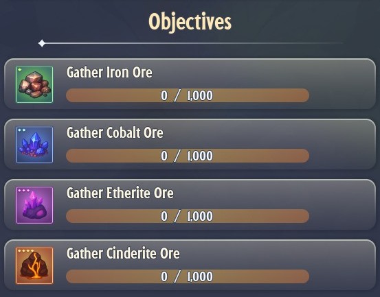 The Storm Tamer quest asks for 1,000 Iron Ore from Everland, 1,000 Cobalt Ore from Cinderveil, 1,000 Etherite Ore from Shardmere, and 1,000 Cinderite Ore from Ashenreach. Once you have finished mining, you can then collect the completed quest in your Quests tab to obtain the rewards.