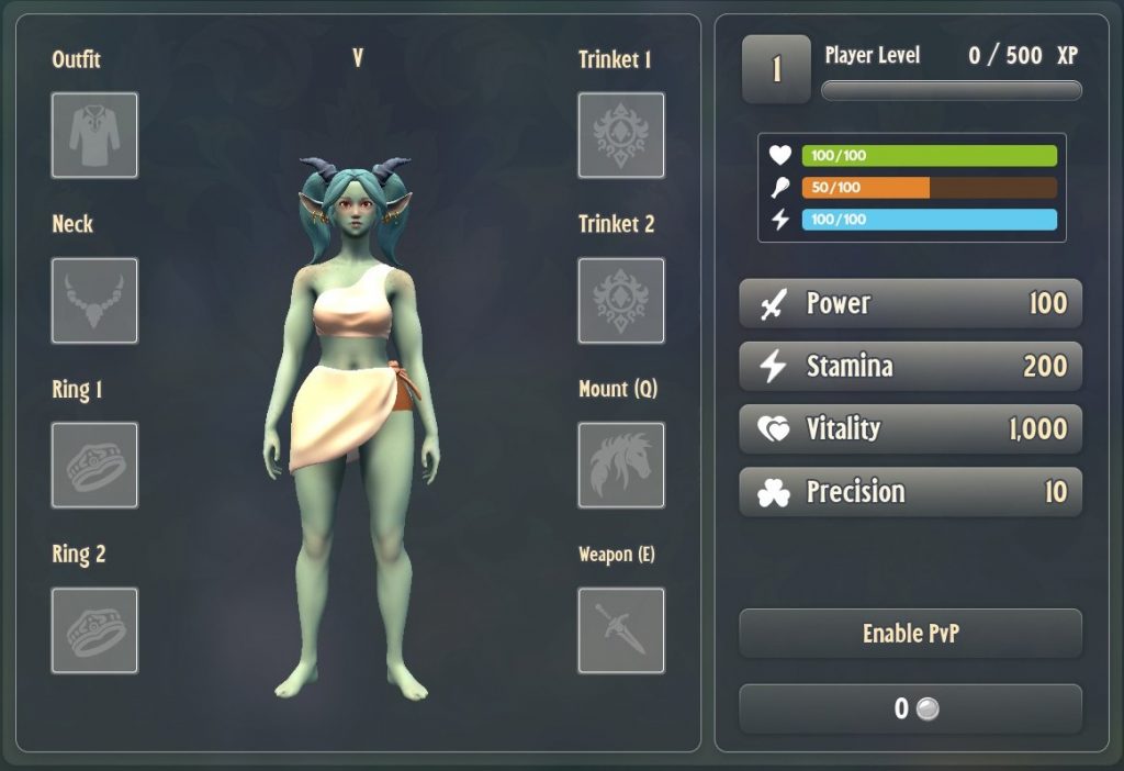 There are 5 different types of gear in Shamania. Each has it’s own Power, Stamina, and Vitality stat. The Weapons also have a Damage Multiplier stat.