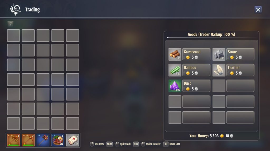 Gold and Silver coins are the currency types in Shamania. You can obtain Gold and Silver Coins by killing enemies and animals, completing quests and milestones, and by selling items directly to Traders or at the Trade Altar.