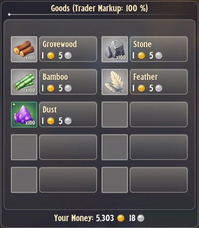 The purchase prices for resources in the Trade Altar are different than the prices for items purchased from Traders, but the sell price for each item remains the same.