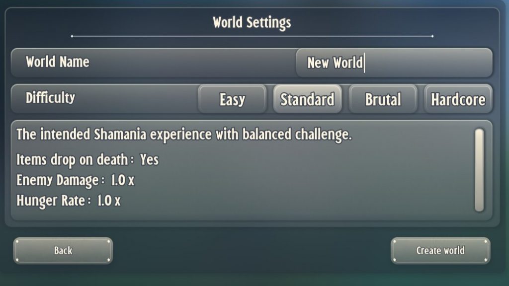 The available World Settings are Easy, Standard, Brutal, and Hardcore. These settings are chosen before the world is created but can also be edited in game by pressing “Esc” under “Edit World”.
