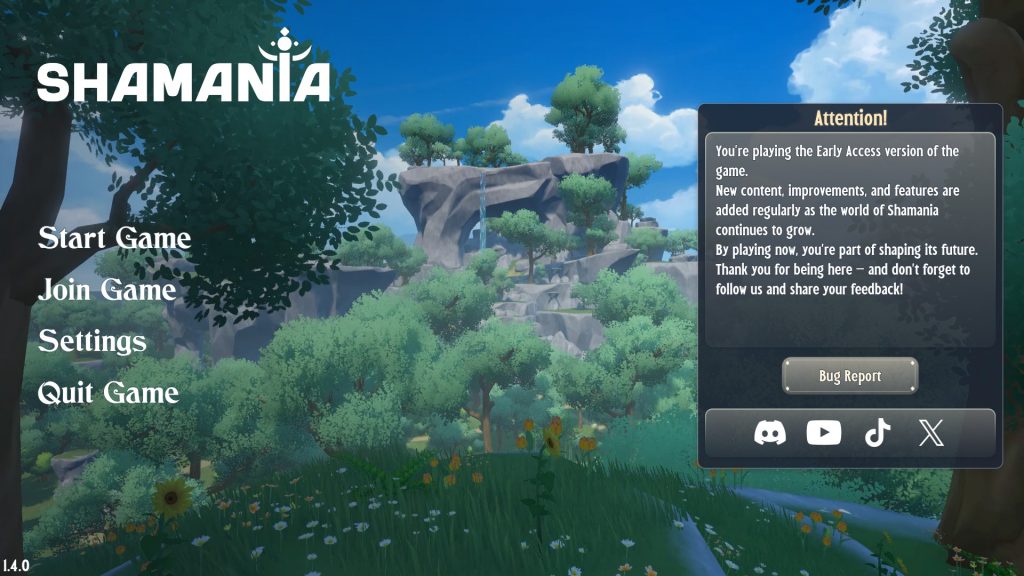 After loading the game you will see four common clickables on the left side of the screen and information on the right. There is also a “Bug Report” button and the links to join or follow Shamania’s Discord, YouTube, TikTok, and X accounts.