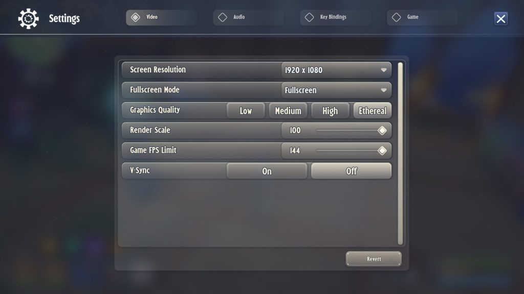 Audio and video settings in Shamania are pretty standard for PC gaming. The best difference is that the Graphics Quality ranges from Low, Medium, High, and Ethereal. The Settings page also displays Key Bindings and options for Game Settings which are listed below. All settings can be accessed while in game also.